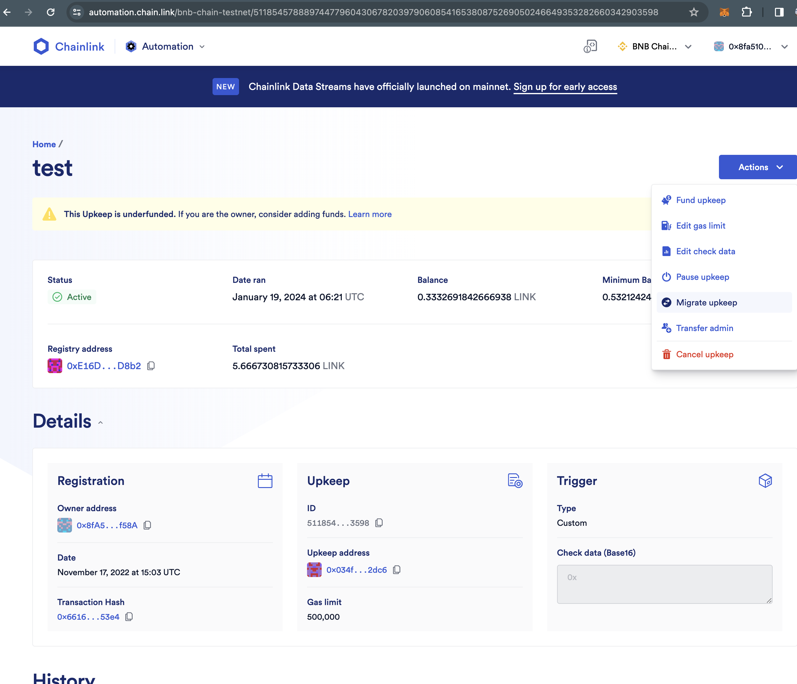 Return to the main Chainlink Automation App landing page. Register a new upkeep, providing the Upkeep address of your old upkeep.